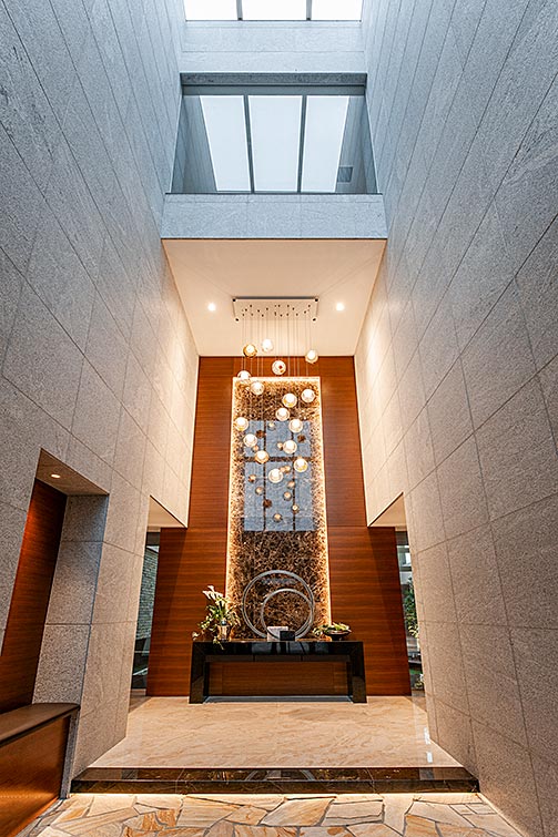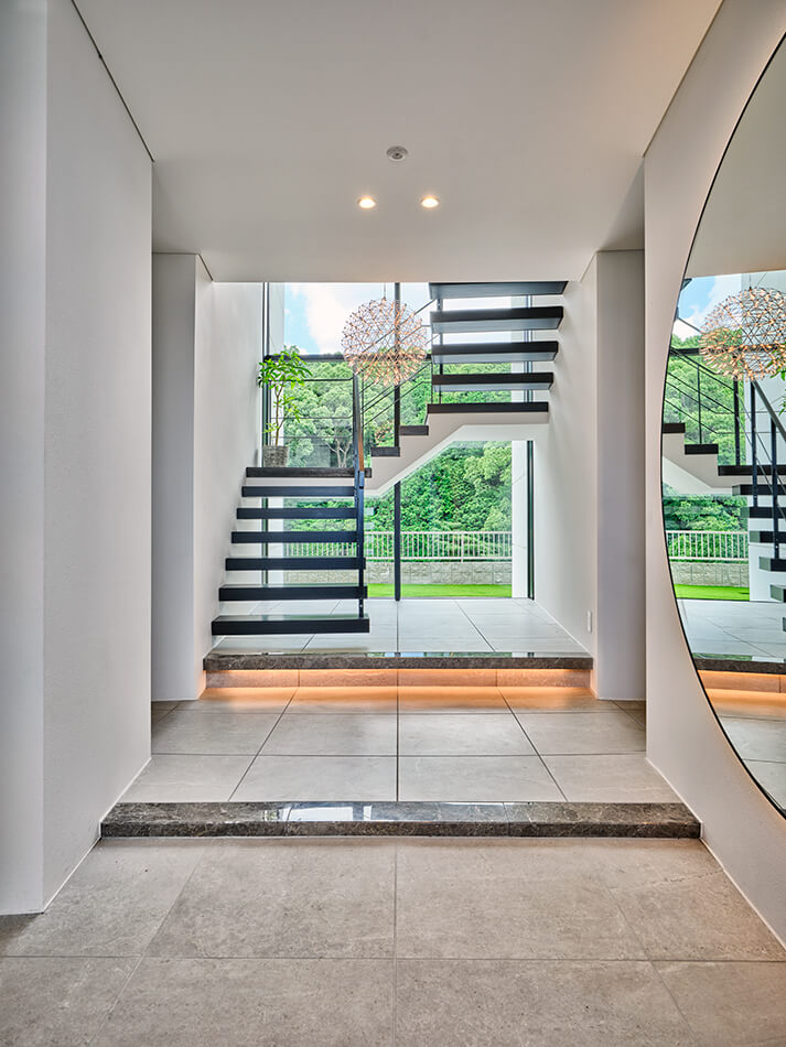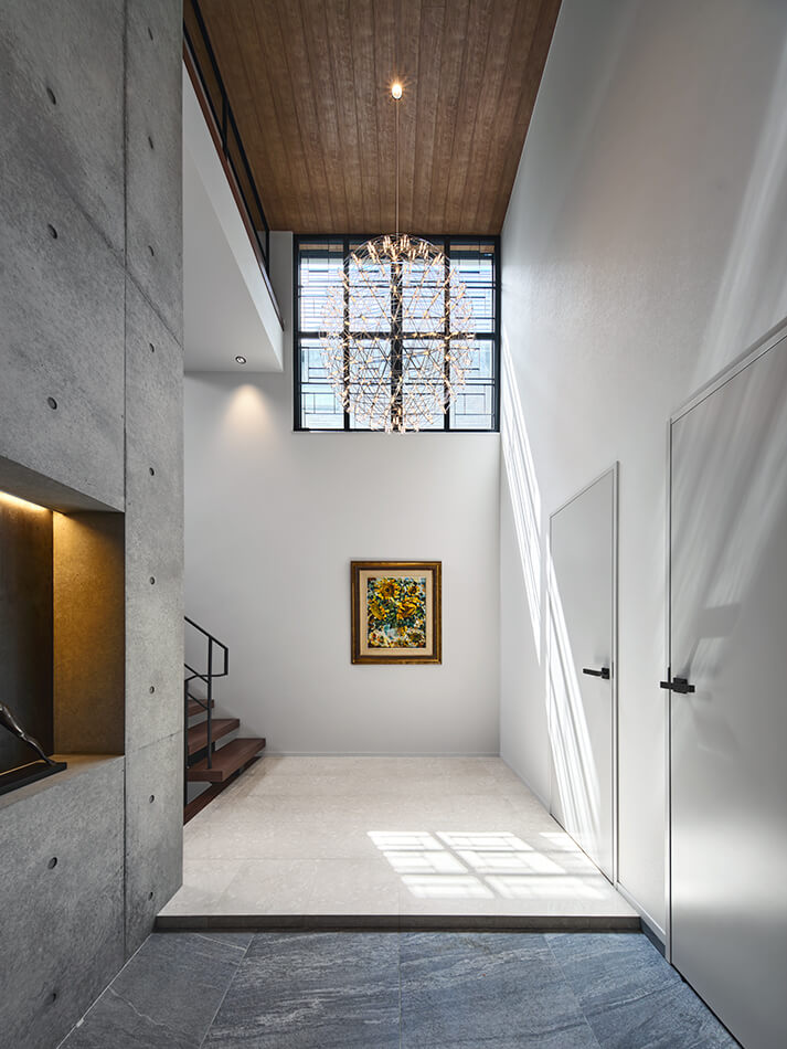 アプローチに導かれるように進んだ先には3層吹き抜けのエントランスが出迎えます。トップライトから陽光が注ぎ、 BOCCIのシャンデリアが空間に浮かぶ印象的な空間。間接照明を施したアクセントウォールを正面に、パブリックスペースとプライベートスペースを明確に分ける動線設計により、訪れる人を自然に誘導可能です。自然光と美しい照明計画が調和し、まるでホテルのロビーのような上質な雰囲気を演出します。