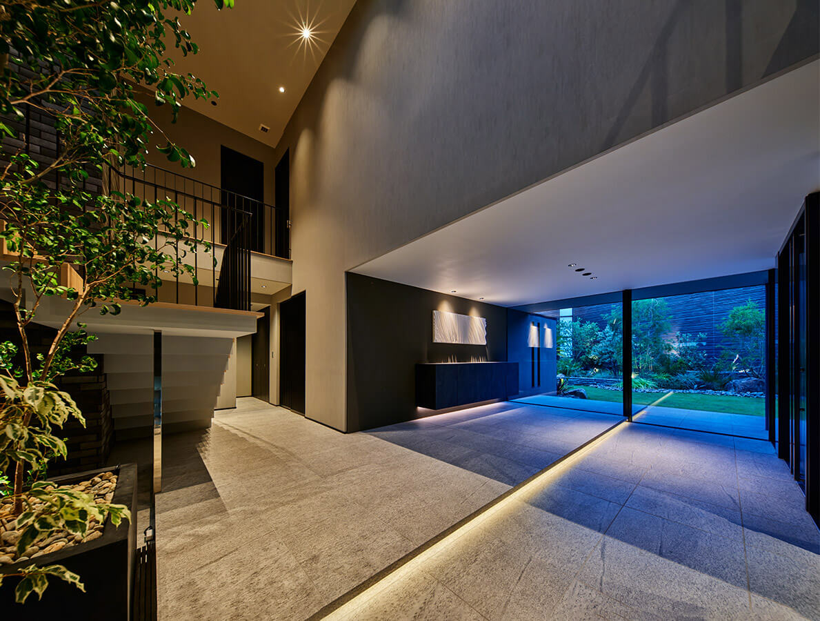 高級住宅の玄関では、シンボルツリーやオブジェとなる家具を配することで、ホテルや美術館のような格調高い演出が可能です。ピクチャーウィンドウに映る樹木は空間に有機的な潤いを与え、アート性の高い家具は住まい手の美意識を映し出します。