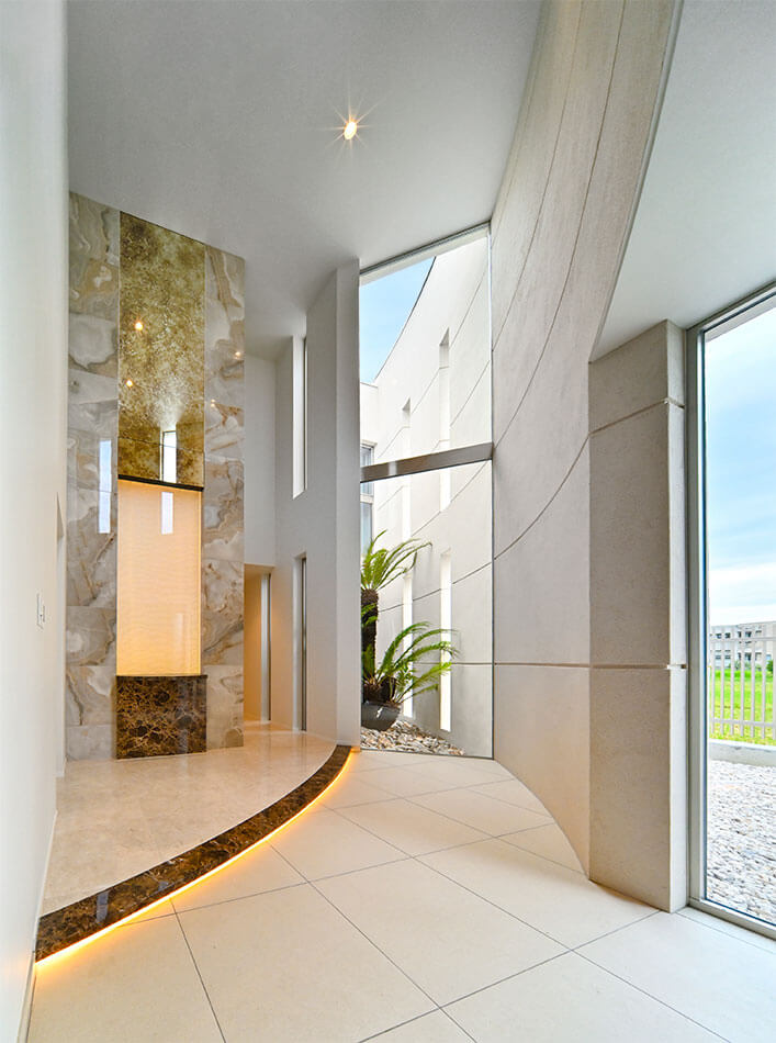まるでホテルのエントランスを思わせるような空間は、訪れる人々に強い印象を残し、住まい全体の品格を高めます。