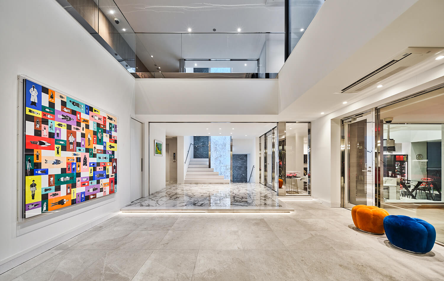 エントランスポーチの両脇に広がるビルトインガレージの車路を通ってたどり着くエントランス。ガレージやプレイルームとガラスで仕切ることで視線が抜ける、開放的な空間を実現しています。閉じた印象の外観とは対照的に、内部は明るく広がりのあるデザイン。白を基調とした空間に、ガレージに停まる真紅の愛車やポップなアートが映え、訪れる人に印象的な迎賓の場を提供します。
