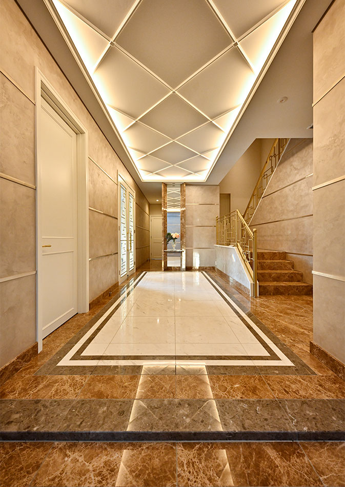 ご夫婦でインテリアの好みが異なるため、フロアごとに異なるスタイルを採用しています。エントランスホールのある1階は奥様の趣向を反映したクラシカルでエレガントな空間。ゲストを迎えるフォーマルな場にふさわしく、大理石調の床や装飾的なディテールが重厚感を演出し、マットゴールドのアクセントが華やぎを添えることで、訪れる人を優雅に迎え入れます。