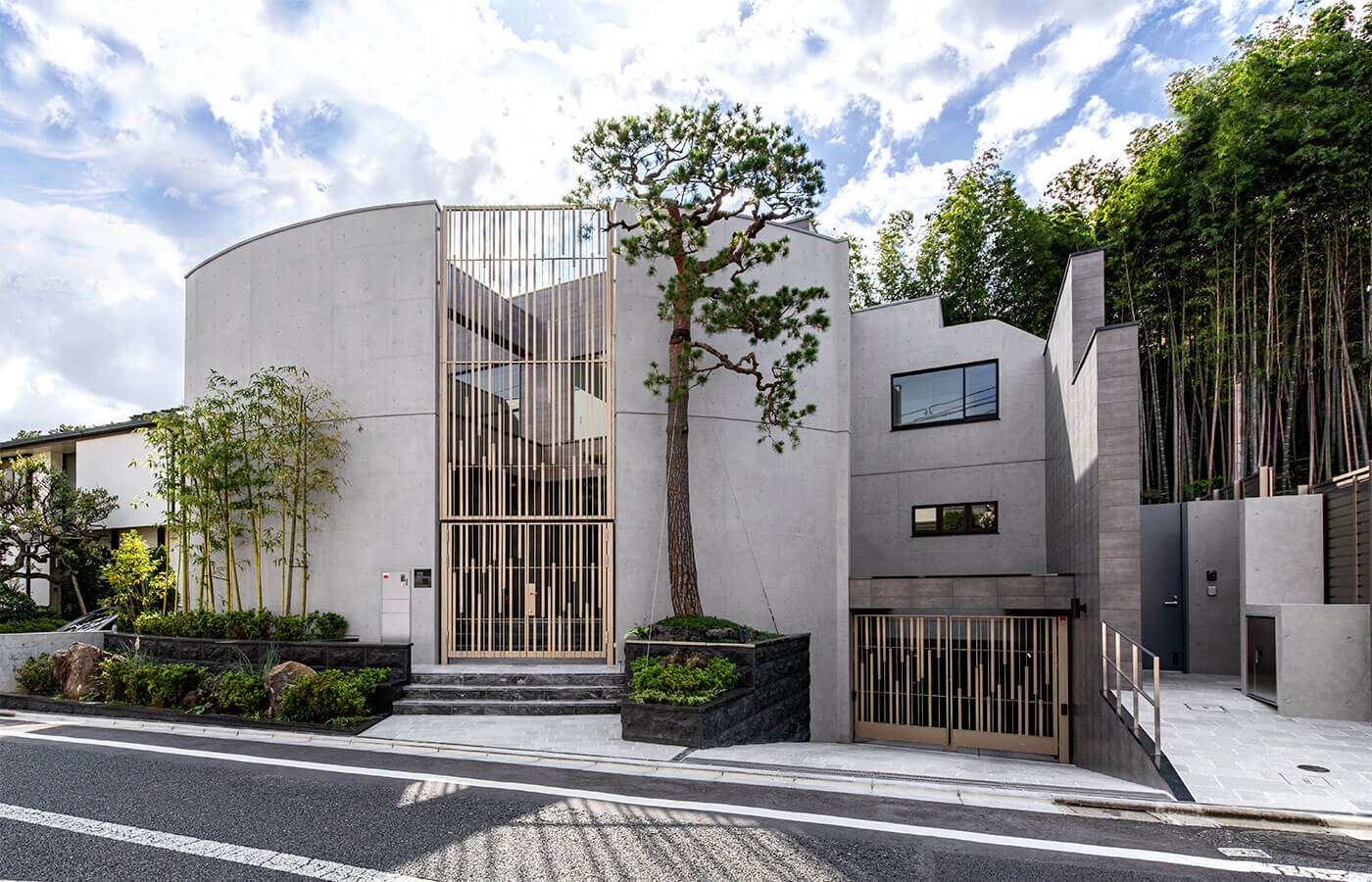 こちらの作品は、異なる素材を用いた縦横に伸びる直線がファサードに立体感を与えるデザインが印象的なモダンハウスです。外観は異素材を組み合わせた直線が特徴で、広い軒や視線を遮る工夫によりプライバシーにも配慮。無機質なミニマルデザインだからこそ、シンプルな直線に美しさが宿る、意匠性を追求した住まいです。