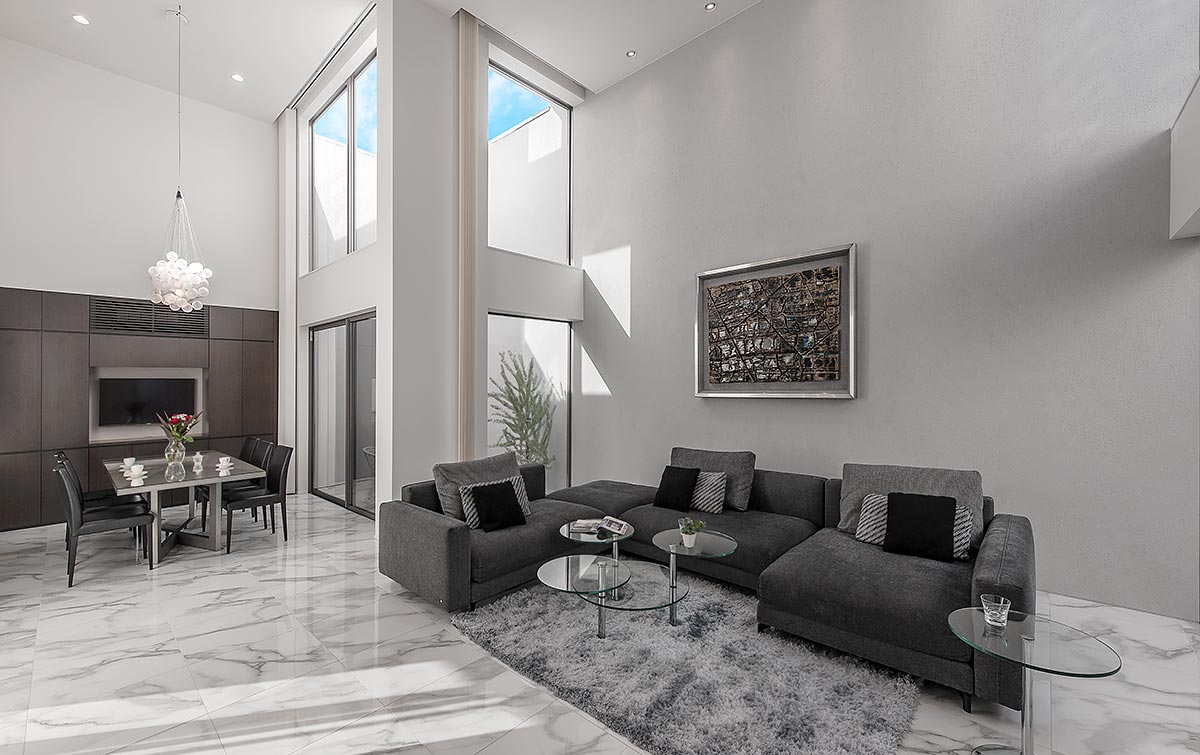 都内の密集した住宅街の中にありながら、外からの視線を遮り、都会のオアシスとなるように計画されました。リビングは天井高5.6mの2層吹き抜けによる大空間。ヤシやパームツリーなどが植えられた庭に向かって大きく開かれたその空間は、生き生きとした緑を一望でき、白とグレーを基調としたスタイリッシュなインテリアが美しく映えます。