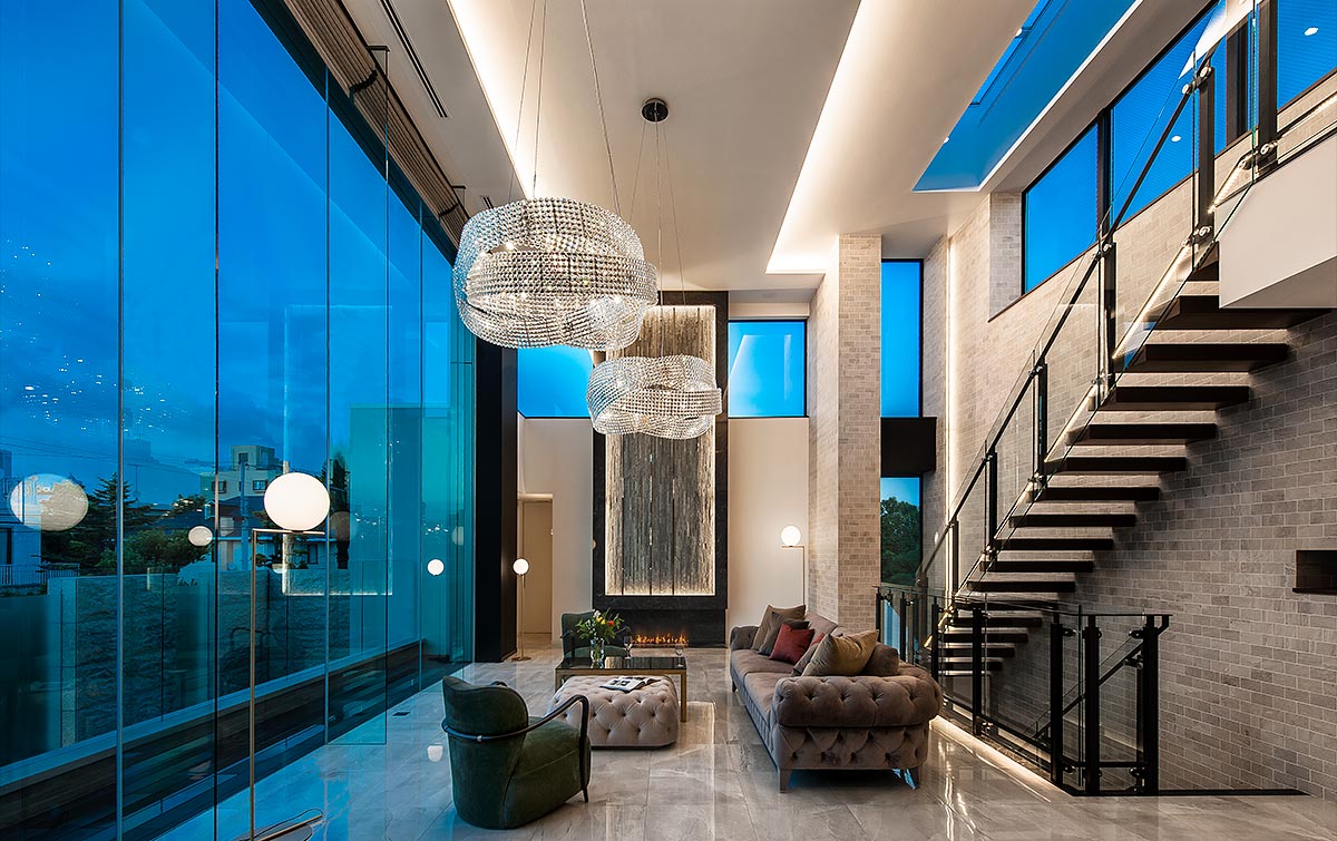 外観は白を基調に、整ったラインとすっきりとした造形を意識したクラシカルな佇まい。一方、内観はダークカラーを基調としたモダンな空間が広がります。リビングは約11mのワイドスパンによる全面開口とし、プライバシーが確保された中庭の景色を存分に取り込む設計に。対面の鏡張りの壁面と鏡面仕上げの床が、さらなる奥行きと開放感を生み出します。