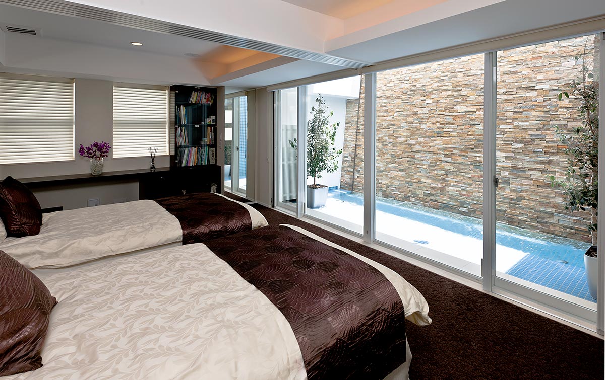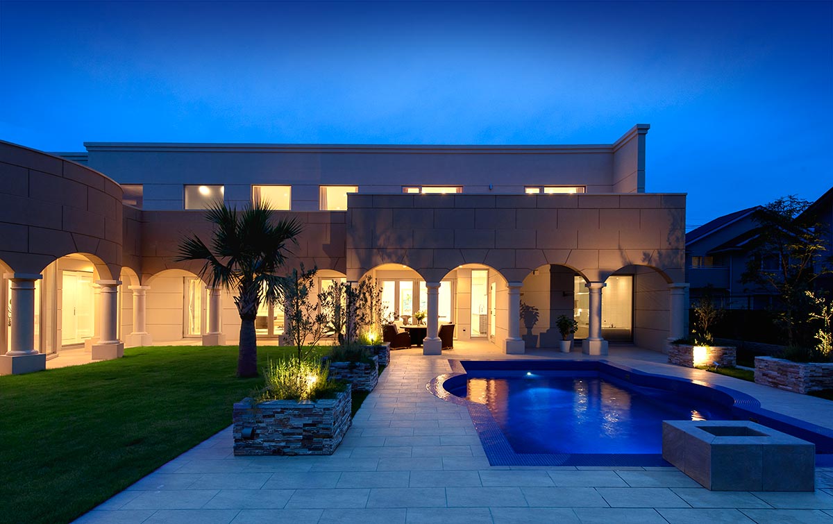 屋外プールはもちろん、リビングやテラスと連続する位置に水盤(ミラープール)を設ければ、穏やかな水の揺らぎを室内から楽しむことができます。夜には照明の演出によって水面が幻想的に輝き、まるで高級リゾートのラウンジにいるかのような雰囲気に。