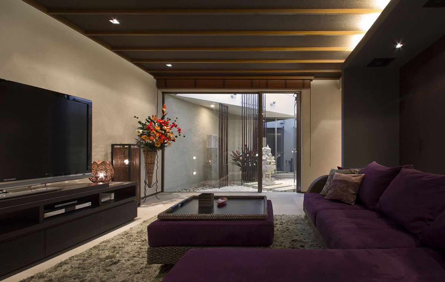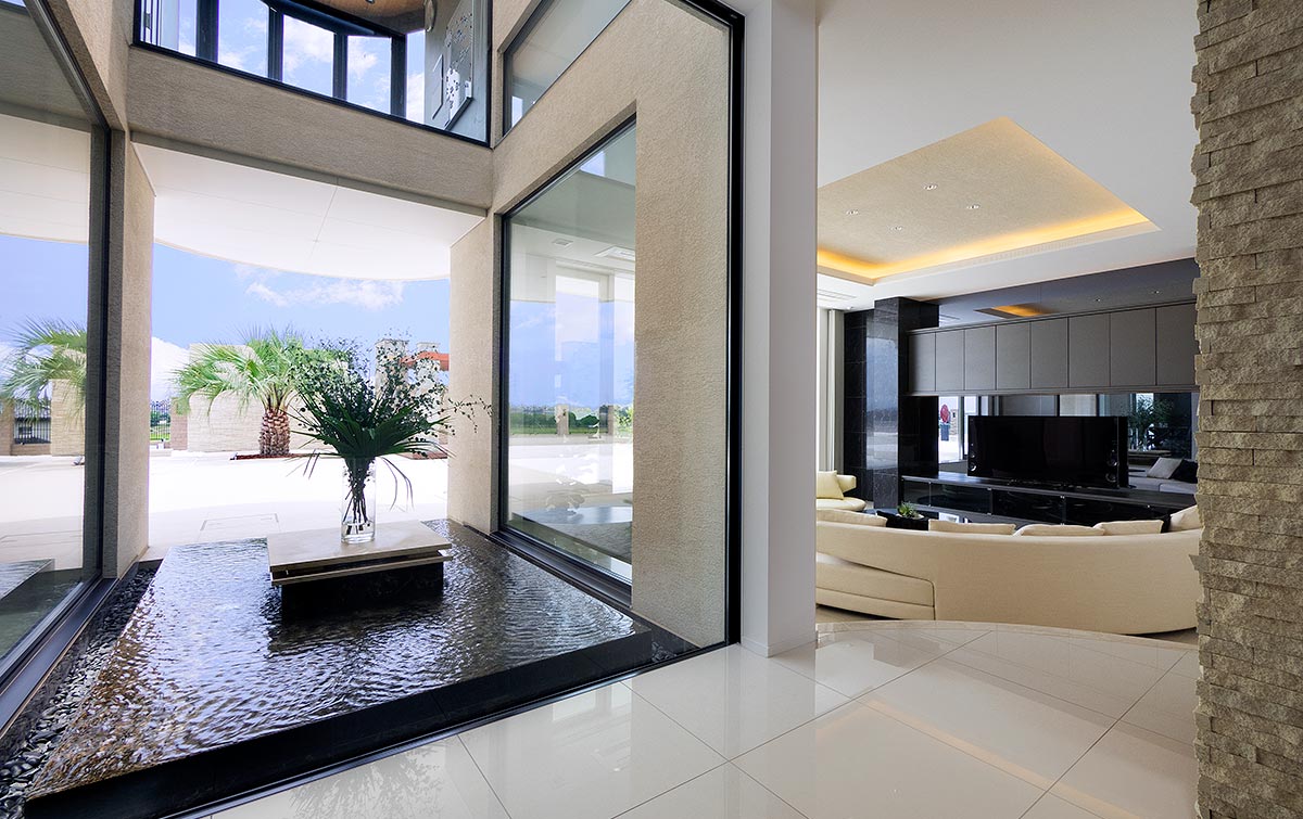 住まいの中心に水盤が設けられており、どこにいても美しい水の流れとその水音を感じられ、リゾート感を満喫可能です。床のレベルを下げて天井高を上げたリビングでは、ソファに座った際に庭の景色をダイナミックに感じられます。