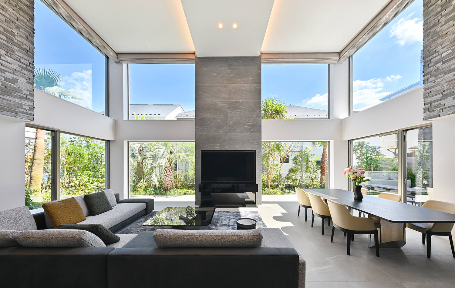 リゾートホテルのような家を象徴するのが、外の景色と一体化した大開口の窓です。主要空間となるリビングやダイニングに大開口を設けることで、室内に自然光があふれ、時間や季節の移ろいを楽しめる住まいになります。