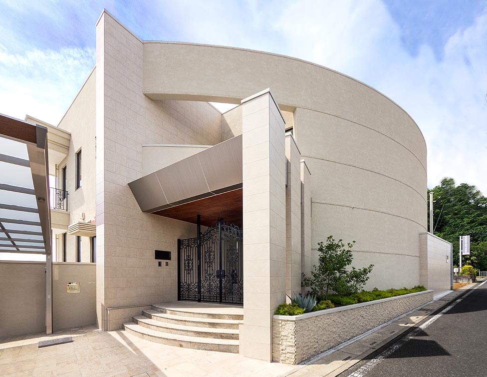 道路側は曲線が、庭側は水平ラインが印象的な住まいです。見る方向によって異なる印象になるのが特徴的。庭には白い小石が敷き詰められ、シンボルツリーであるパームツリーがリゾート感を演出します。