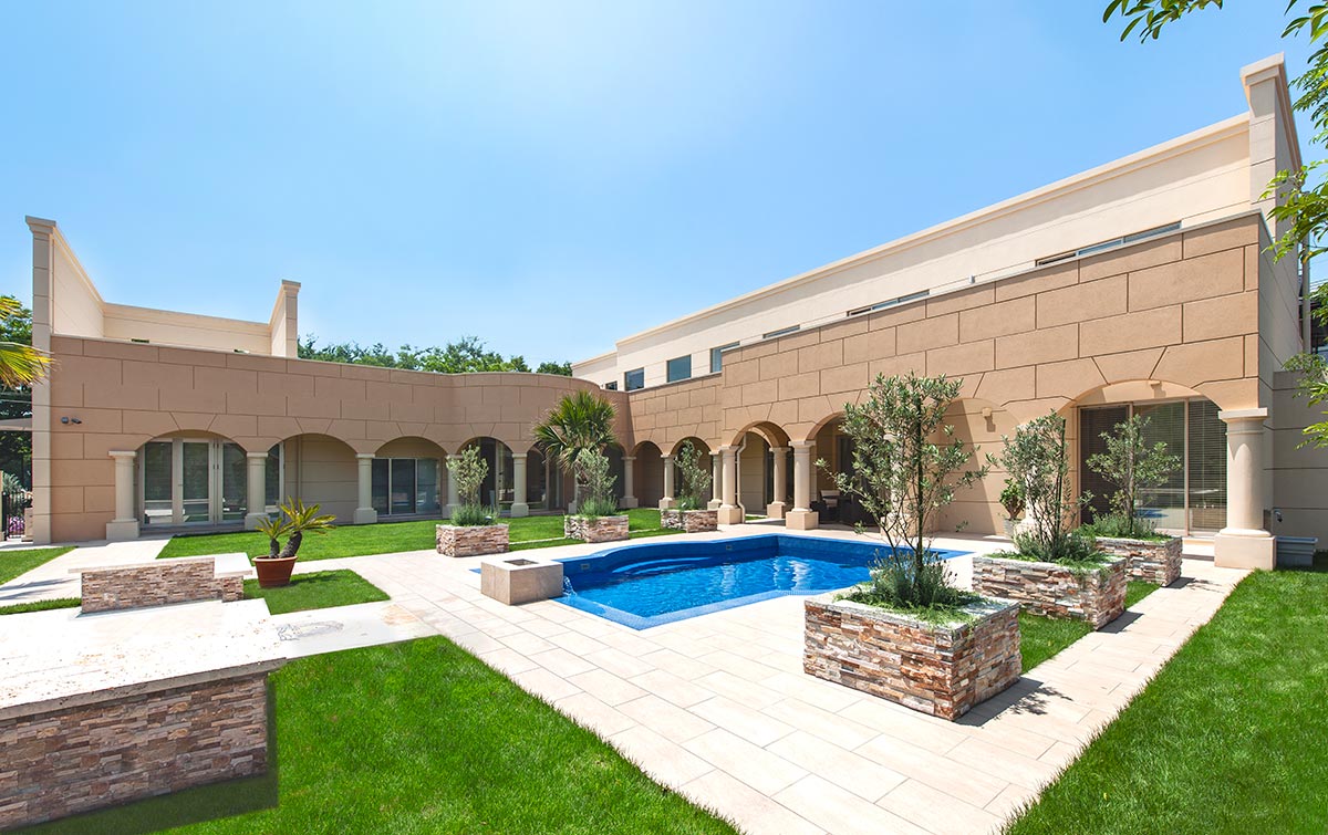 プールや水盤などの「水の演出」を取り入れることで、一気にリゾートホテルのような空間が生まれます。水面に光が反射し、天井や壁に美しいリフレクションを映し出すことで、非日常の静けさとリラックス感をもたらします。