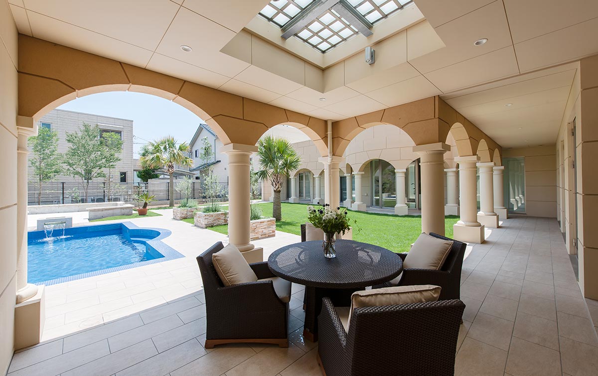 プライベート空間では南側に向かって開口を取っているものの、建物の周囲に回廊を巡らしているため直射日光の強い日差しを回避できます。またダイニングの手前にある回廊の突き当りにはトップライト(天窓)を設けたテラスを設置。アーチで結んだ柱が奥行きを与え、まるでイタリアのリゾートホテルのような印象です。