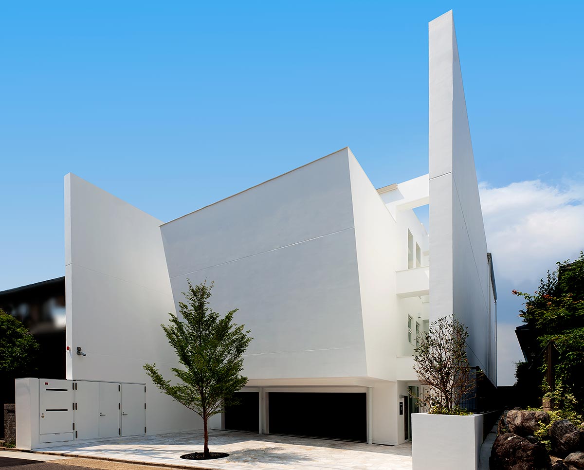 多忙でなかなかリゾート地に行けないオーナーのために、自宅でリゾート気分を味わえる住まいを実現しました。両サイドに立ち上げた壁と傾斜した正面壁によって、外部の視線を遮りながらも開放感を確保。3階をメインフロアとし、広いバルコニーを隣接させることで、屋外と一体感のある空間を演出しています。傾斜壁の内側には3階から2階へ流れる滝を設け、涼やかな水音と風が通り抜ける快適な環境を実現。1階には吹き抜けのトップライトやドライエリアを設け、自然光が白い壁に反射して明るさを保ちます。