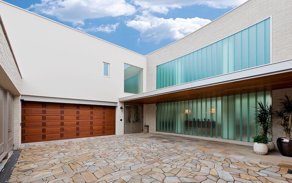 「庭園を内包する離宮」の一軒家は、直線で構成された外観デザインです。悠然とした佇まいを引き出すためシンメトリーを意識し、門から敷地内を進むアプローチにかけた屋根が、一直線にエントランスまで続きます。まるで天空のレッドカーペットのように訪れたゲストを出迎えます。
