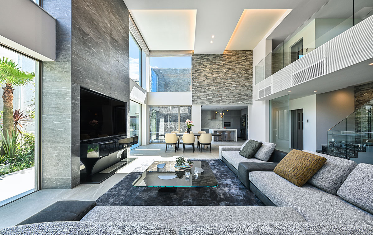 2層吹き抜けのリビングは扇形の曲線に沿って大開口を設け、西側の公園の借景を楽しめる開放的な設計に。エントランスにはコンクリート打ち放し、床には無垢ウォールナットを用い、シャープさと温もりを両立。リビングの鉄平石の壁が、自然素材の力強さと上質さを際立たせています。
