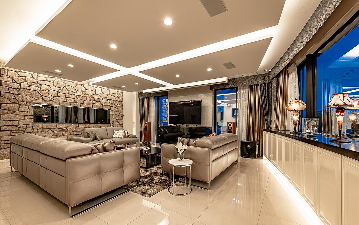 おしゃれな家づくりにおいて、照明は“明るさを確保する設備”ではなく、“空間を演出する装置”です。重要なのは、天井のダウンライトだけに頼らず、間接照明とスポット照明を組み合わせること。壁や天井をやわらかく照らす間接照明は空間に奥行きを与え、アートや素材を照らすスポット照明は視線を誘導します。光を重ねることで、立体感のある住まいが生まれます。