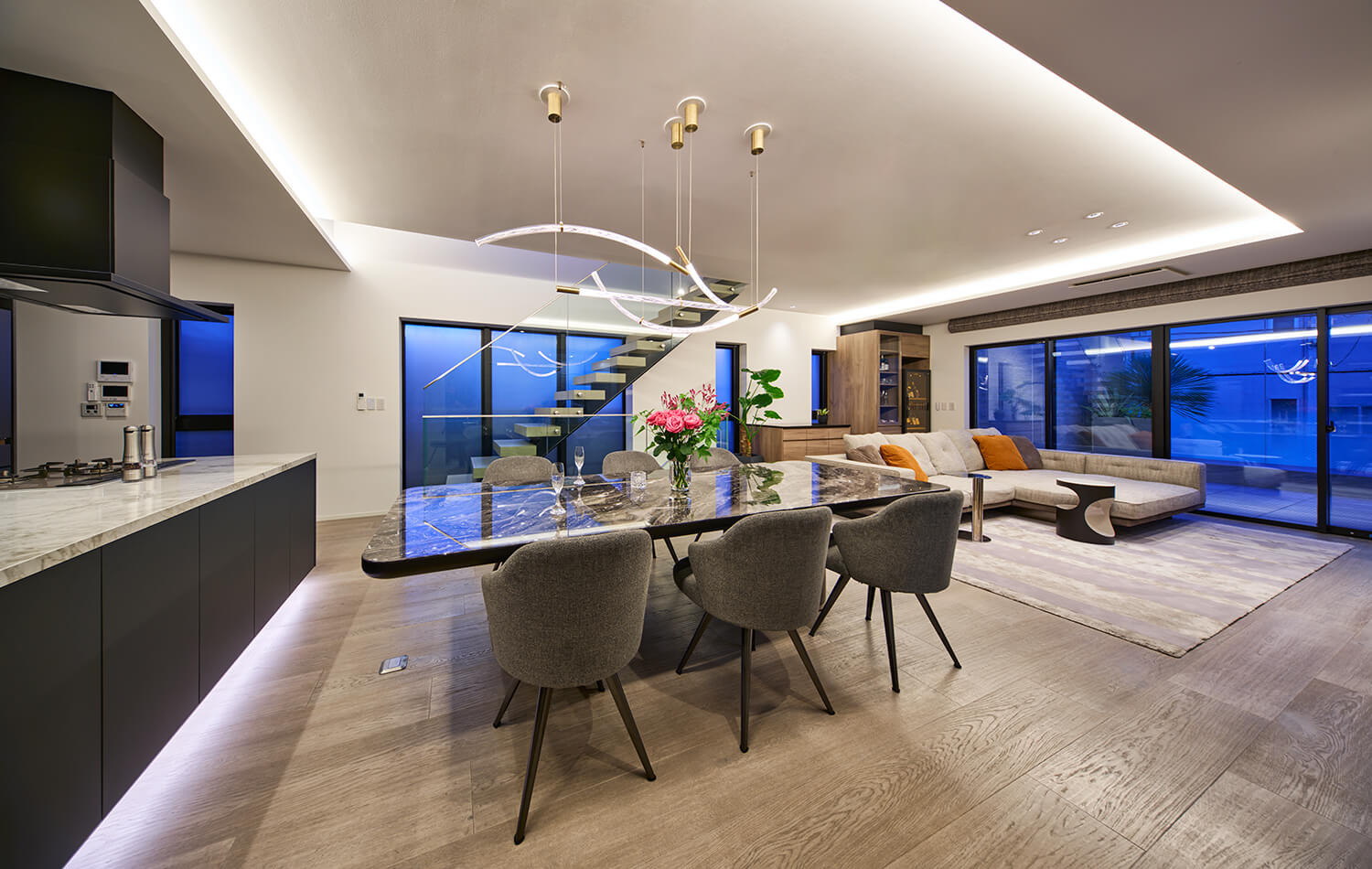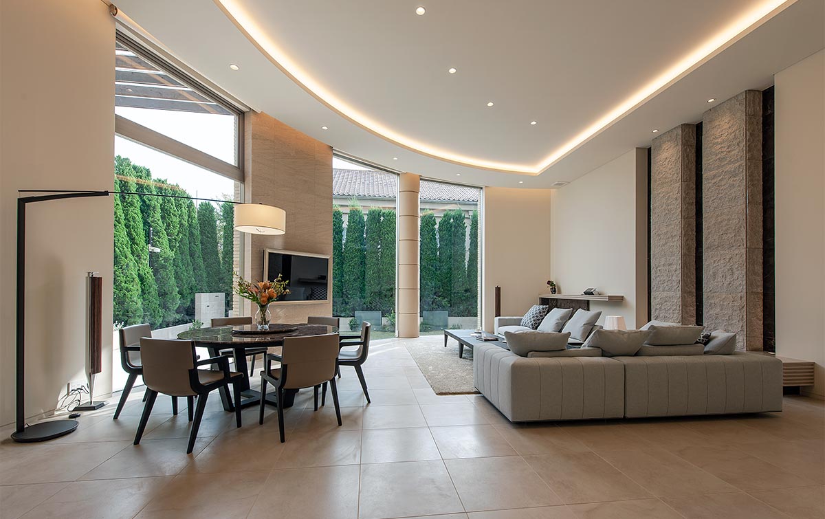 厳しい建築規制をクリアした高級住宅街に建つ住まいです。ファサードは流れるようなラインを描き、庭側からの外観も丸みを帯びた美しい曲線としました。建物を俯瞰すると無限を表す∞の形を示し、ゆとりある間取りと二層吹き抜けのリビングダイニングで開放感を演出しています。寝室からバスルームまでつながるホテルライクな動線や、フルオープンの開口から緑豊かなバスコートに出られる設計も特徴です。バカラのシャンデリアやアイアン手すりなど、モダンとエレガントを融合させたインテリアが上質な雰囲気を生み出しています。