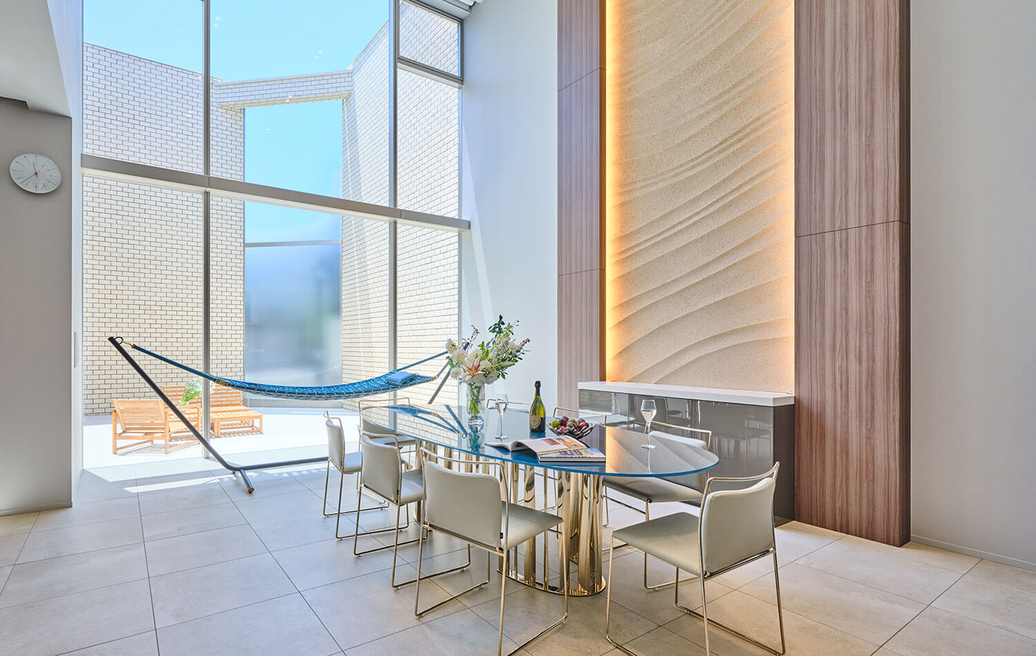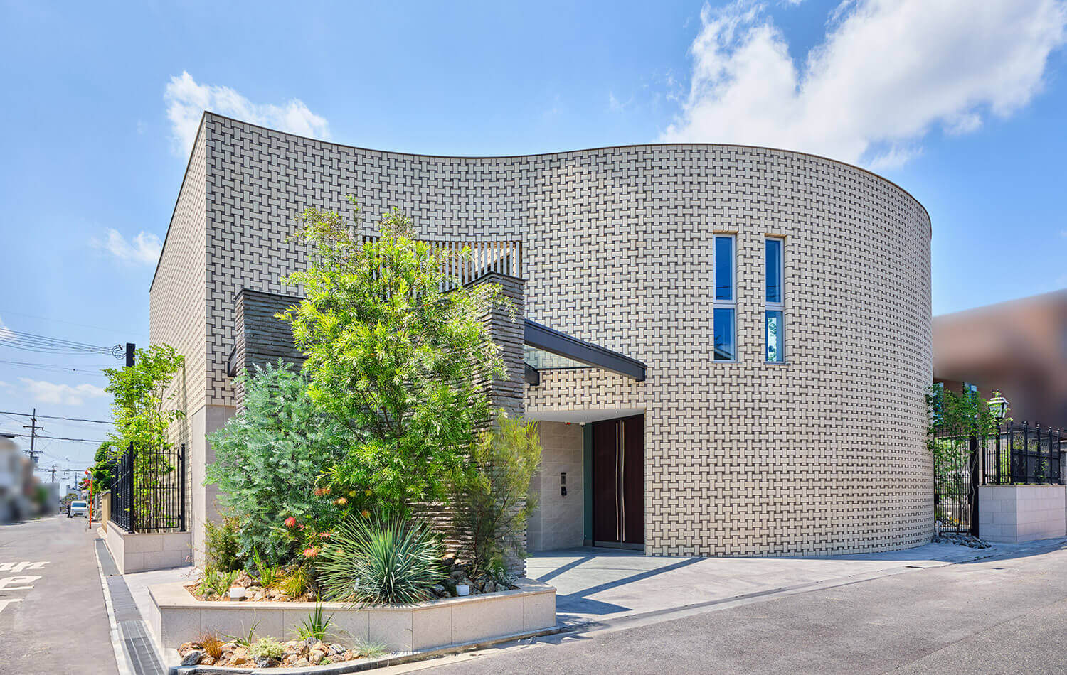 閑静な南東角地という立地を生かし、高級一軒家ならではのデザイン性を最大限に引き出した住まいです。周囲の視線を遮りながらも、光と風が心地よく巡るように設計し、外観にはこの住まいのためにあつらえた特注タイルを採用。柔らかな曲線が建物に工芸的な美しさを与え、上質な佇まいをつくり出しています。