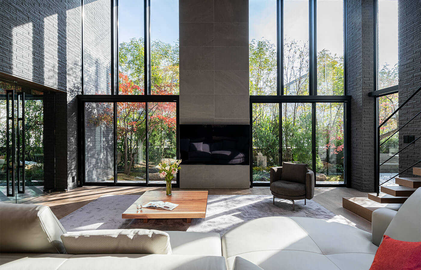 コンクリート・木・ガラスのバランスを細部まで検証し、端正でモダンな印象にまとめたインテリアは、黒やグレーのシックなカラーリングに天然木を合わせ、上質で落ち着いた空間に。玄関からLDK、和室、庭へと連続する視線の先には豊かな植栽が広がり、都心にありながら四季の移ろいを身近に感じられます。素材選びからディテールに至るまで「万事徹底」で質を追求した、高級一軒家の魅力を体現する一邸です。