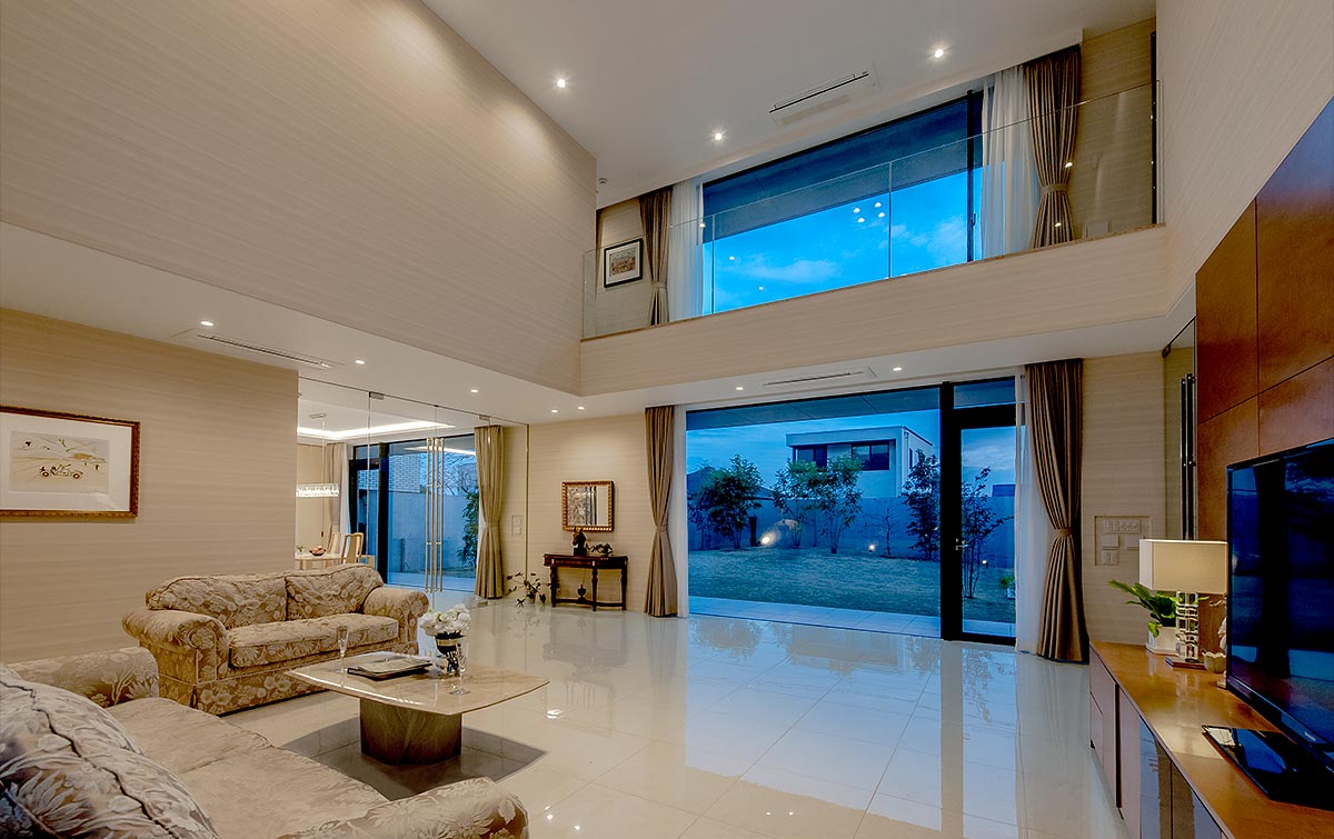 さらに、二階建てでは吹き抜けやスキップフロアを活用することで、上下階をつなぐ立体的な空間の広がりを演出できます。これにより、二階建てでも平屋のような一体感と、立体的な広がりを兼ね備えた高級住宅らしい空間が完成します。