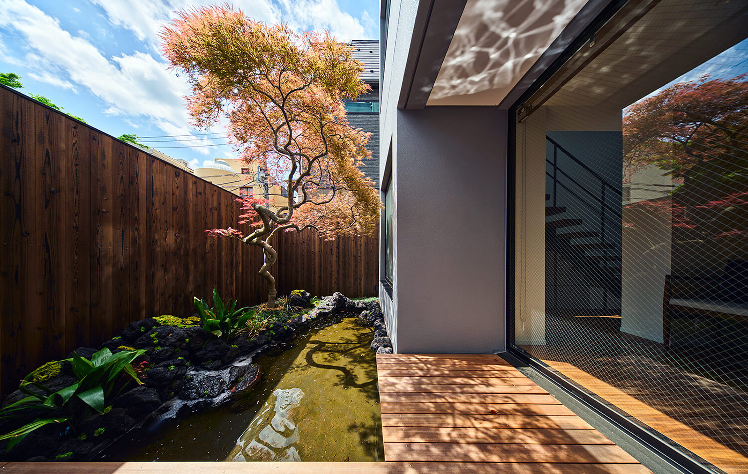 日本建築では、借景や坪庭を活かした、奥行きのある外部デザインとして周囲の自然を“借りて”取り込む借景が古くからの知恵として活かされてきました。遠景となる山の稜線や庭の樹木のシルエットを、窓や縁側のフレーミングによって美しく切り取ることで、外部の景色が建物の一部のように感じられます。また、敷地内部に設ける坪庭は、住まいの中心へ光と緑を届け、静けさと潤いをもたらす優れた装置です。水盤や石組みを加えることで、より深い情緒を演出できます。
