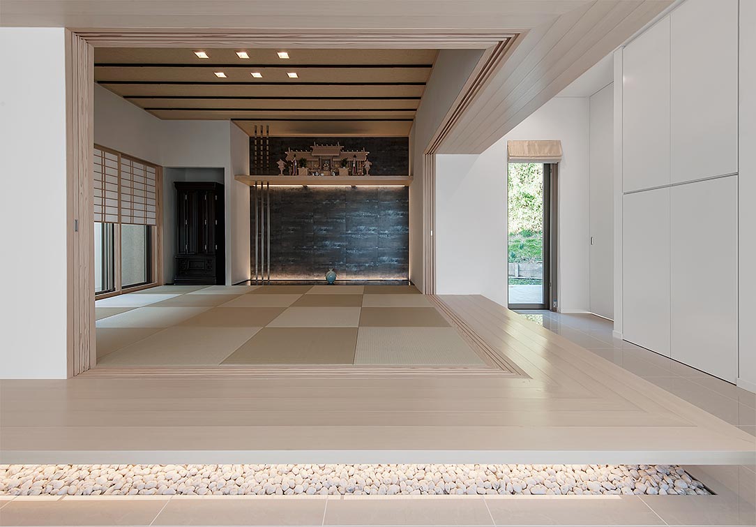 内装では、リビングやダイニングをモダンにまとめる一方で、ゲストルームを兼ねた和室に向かう廊下には地窓を配し、ゲストルームは雪見障子や床の間、敷石など伝統的な意匠が息づく和の空間を創出。現代の暮らしに寄り添いながらも、静かで落ち着きのある住まいです。