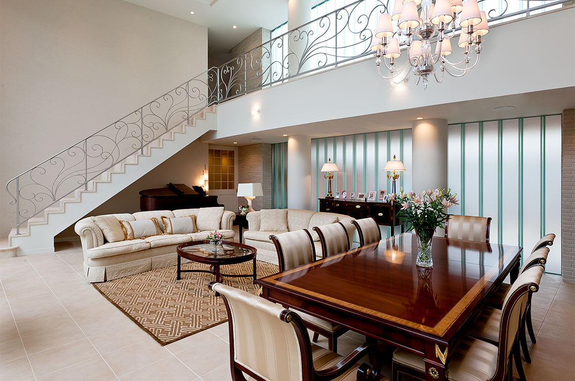 訪れる方にとって、リビングはその家全体の印象を左右する場所といえます。そのため、インテリアの選定や空間構成には細やかな配慮が必要です。来客が多い場合はホームパーティーなども想定し、リビングとテラスがひと続きになる間取りなど、動線や家具の配置など細やかな配慮が、高級住宅には求められます。