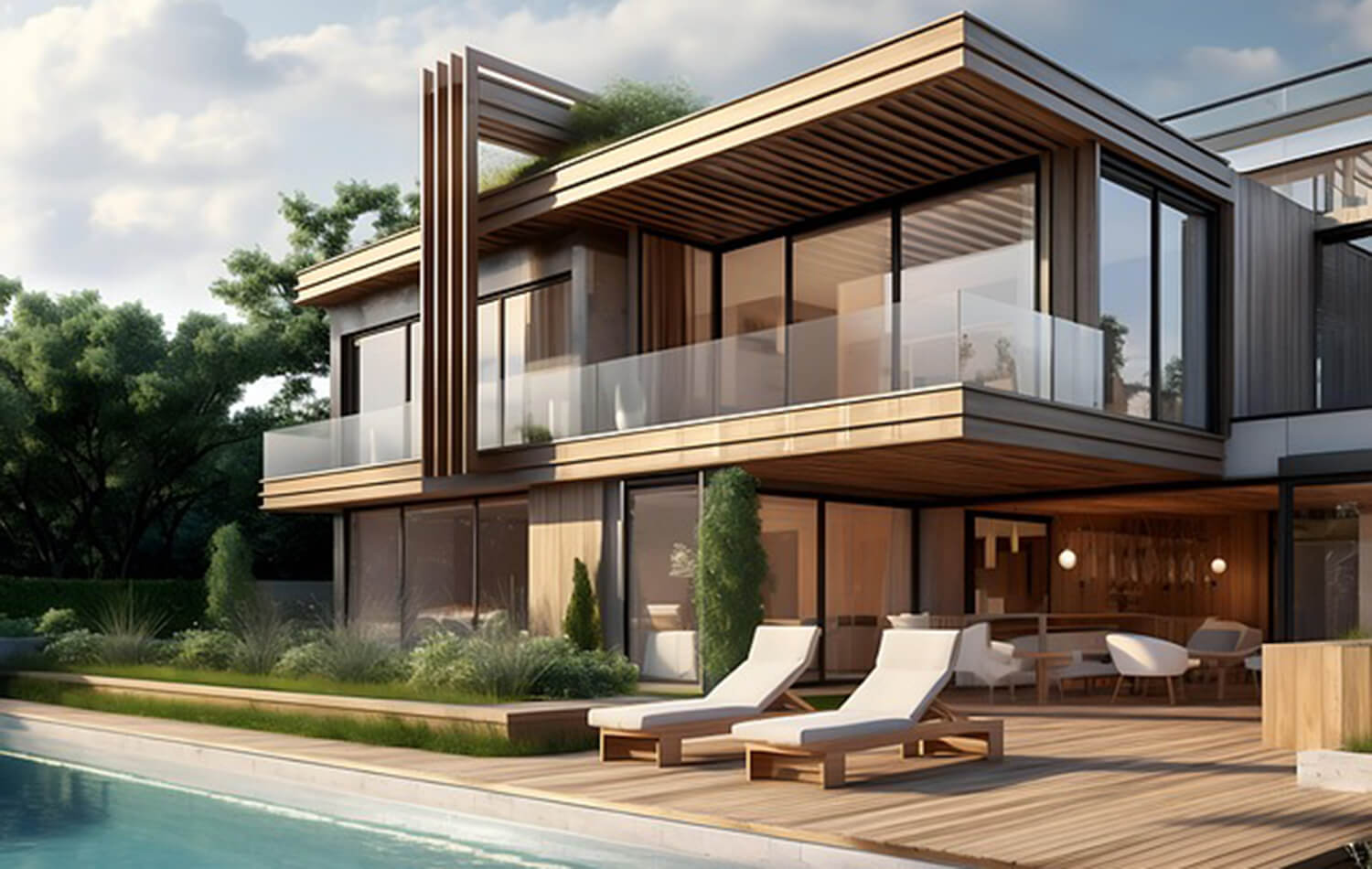 ラグジュアリーな家において、テラスは建物(内部)と庭(外部)をつなぐ重要な「境界のデザイン」です。リビングやダイニングとフラットにつながる設計にすることで、室内の延長として自然を感じられる開放的な空間が生まれます。床材や天井仕上げに共通の素材を用いると、内外の一体感がさらに高まり、まるで空間が屋外へと溶け出すような感覚を演出できます。
