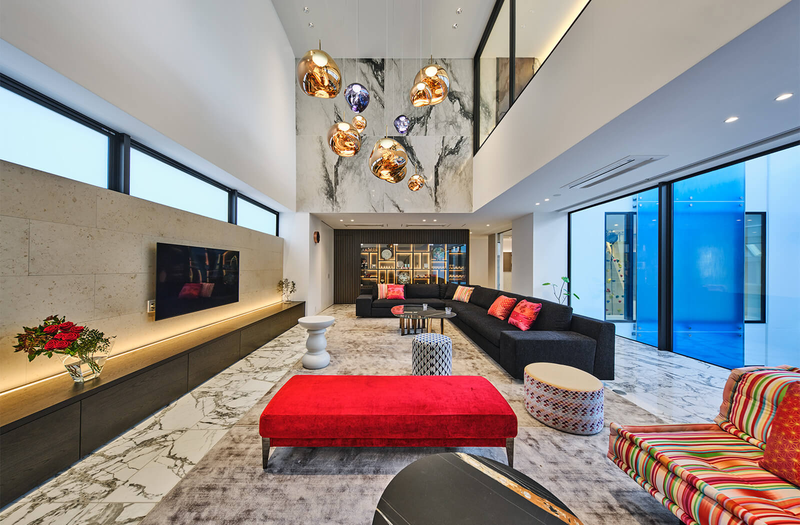 都市型ホテルのように暮らす、高級モダン住宅。プールやボルダリングを備えたアクティブな空間と、和の趣を感じる落ち着いたフロアなど、テーマごとに構成された多層的な住まいです。中央に配置したメインパティオをはじめ、計5つの吹き抜けを設けることで、光と風が巡り、空間同士のつながりが生まれます。ガラスの仕切りにより、家族の気配を感じながらも心地よい距離感を保てる構成です。