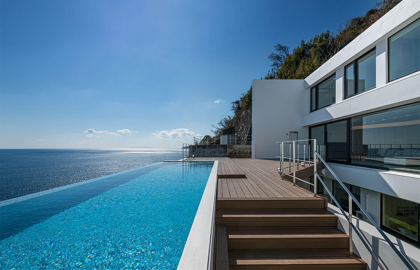 1つ目の事例は、インフィニティプールを中心に、海を望む絶景ロケーションに建てたリゾートハウスです。塩害や台風などの可能性を考慮し、シンプルな外観に深い庇やシャッターなどを組み合わせた、開口部を守る設計になっています。また、見晴らしの良い3階にLDKを配置。LDKからはプールや海の景色を楽しむことが可能です。