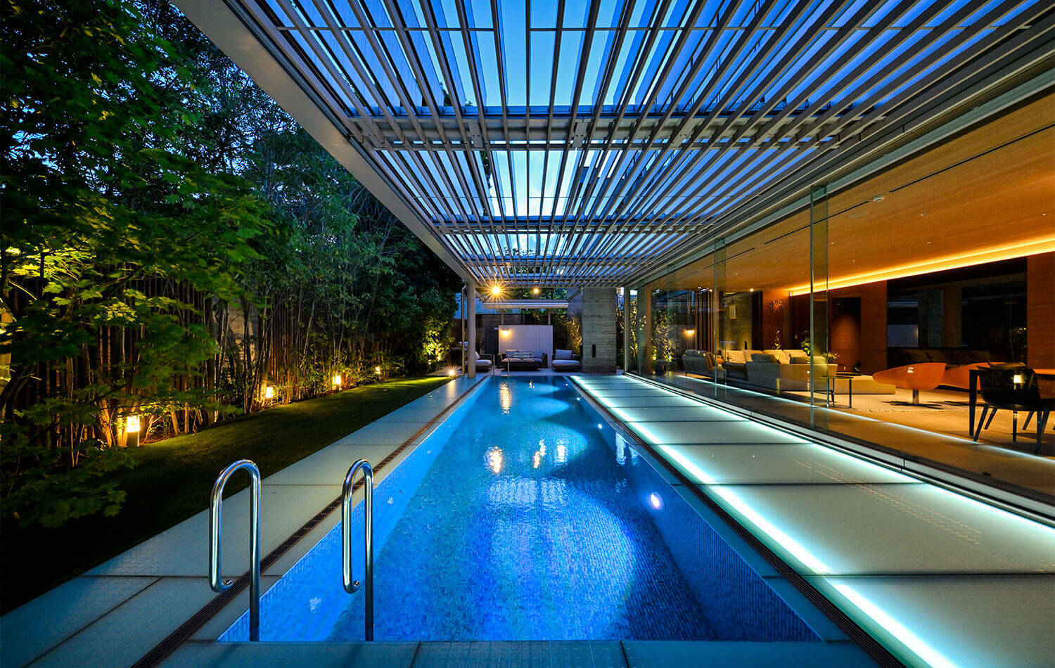 2つ目の事例は、都心に建つリゾートハウス。南洋風の植栽や屋外プールが美しい景観を生み出し、周囲の環境に左右されることなく、非日常を味わえる空間を実現しました。