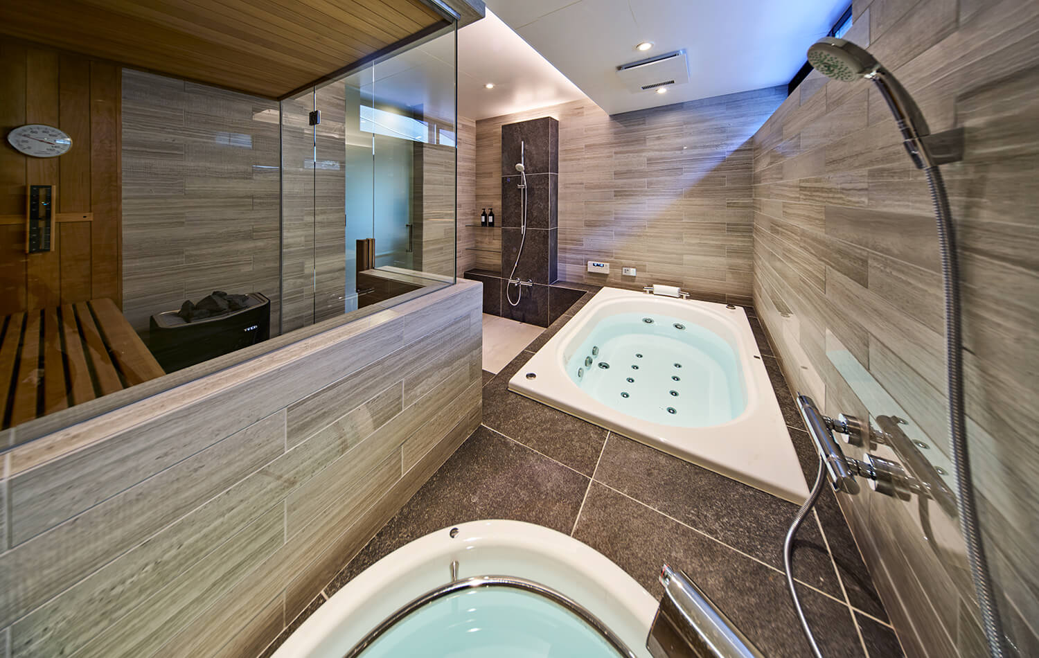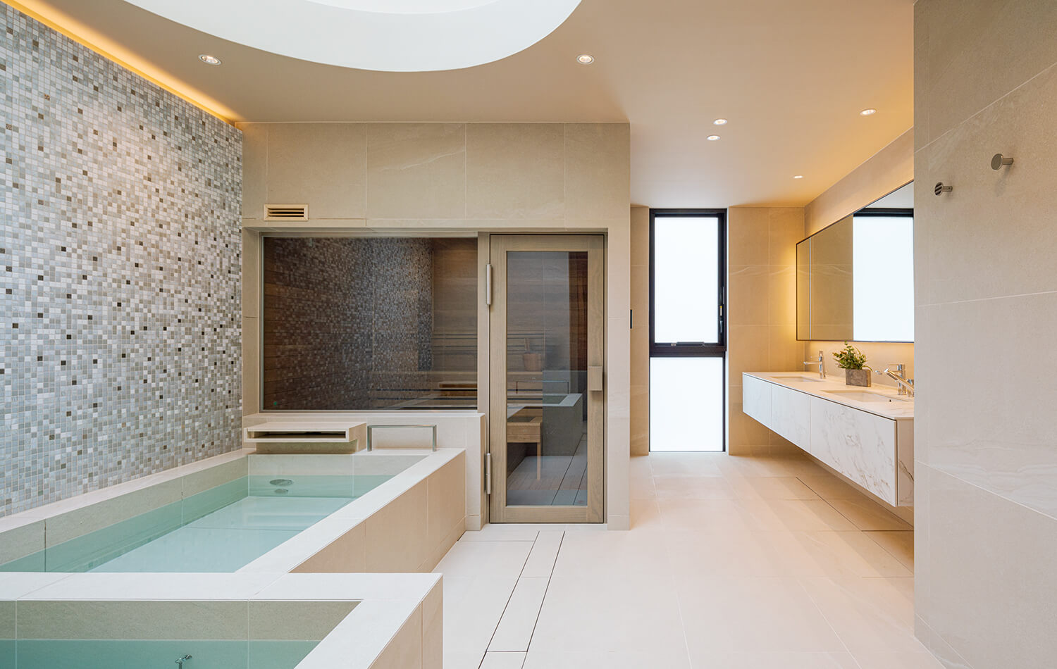 洗面室から脱衣室、バスルームへと続く水回りは、床材と壁材を揃えることで一体感と流れるような連続性を実現。バスルームは温浴、サウナ、水風呂を備え、高窓から外気も取り込めます。