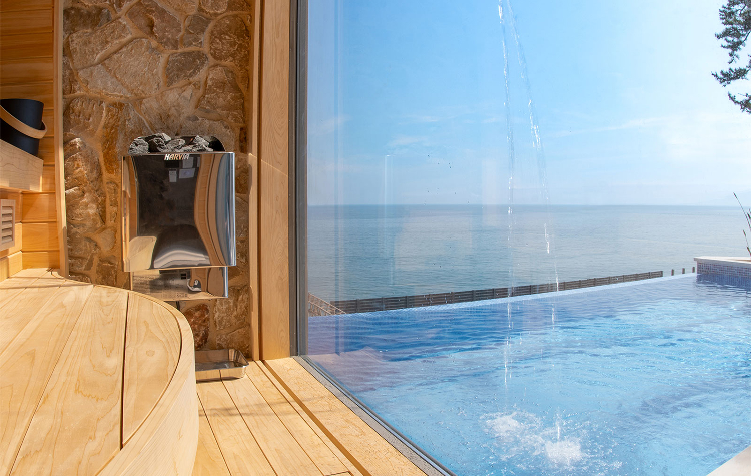 インフィニティプールに隣接して設けられたサウナから、海を一望できるぜいたくな住まいです。プールとテラスが一体化した設計により、リゾートホテルのような非日常の癒やしを享受できます。