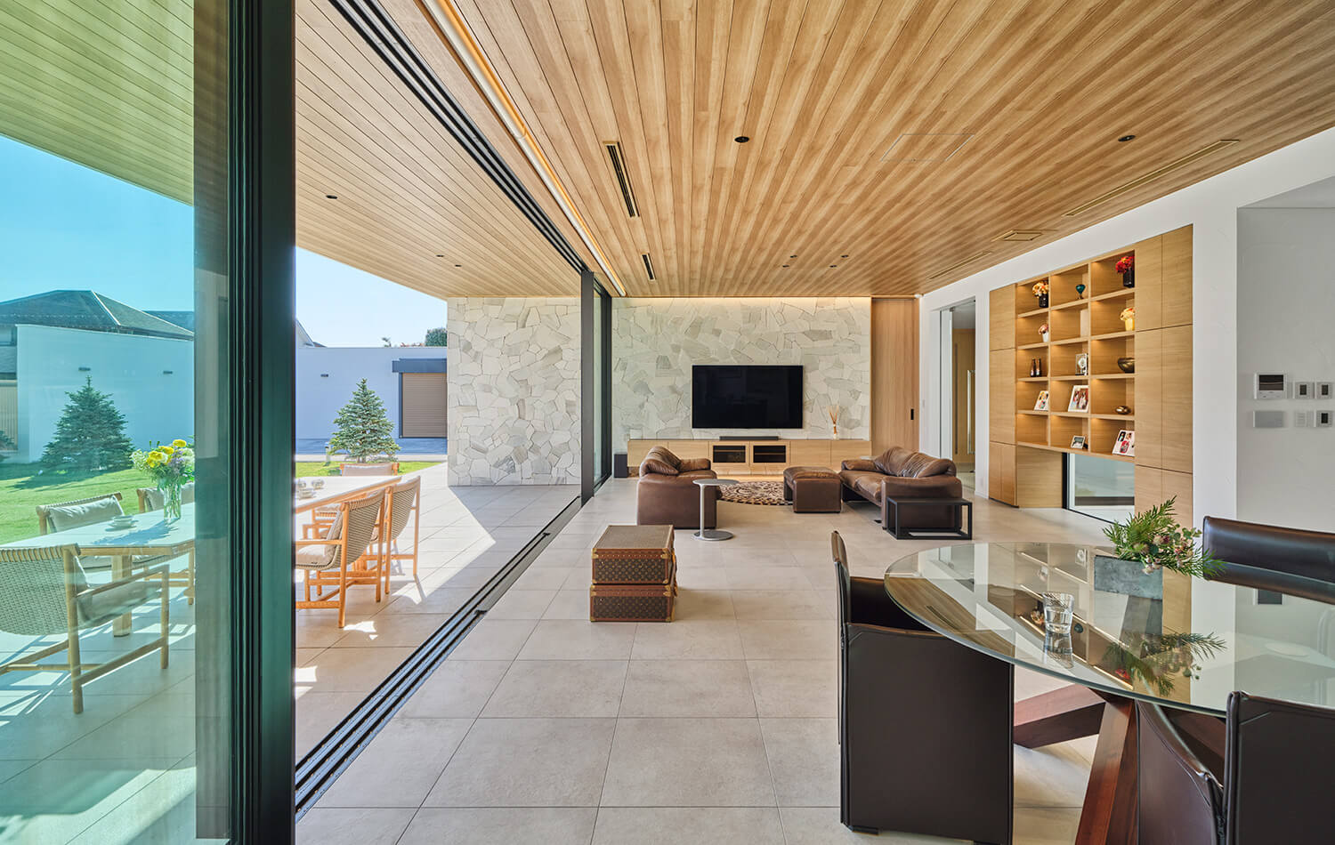 水平ラインを強調したデザインが印象的な平屋です。中庭に面して薄く設計された庇を2方向へ伸ばし、芝生の庭を囲むように構成しています。内外の天井を同じ木目で揃えることで、庭との一体感を高めました。グレーの大判タイルの壁が水平のアクセントとなり、伸びやかな印象を演出。幅約7mの大開口はテラスと室内をシームレスにつなげ、開放的なリゾート空間を実現しています。柔らかな素材と色調が調和した、上質でくつろぎの住まいとなりました。