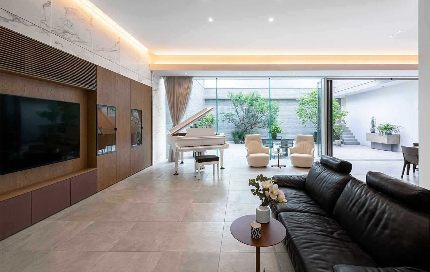 ガラス天井のインナーアプローチを抜けると、吹き抜けのホールの先に中庭と一体化した開放的なリビングが広がります。縦と横の広がりを巧みに組み合わせた構成により、伸びやかで奥行きのある空間を実現。中庭を介して各フロアがゆるやかにつながり、家族の気配を感じながらも程よい距離感を保てます。