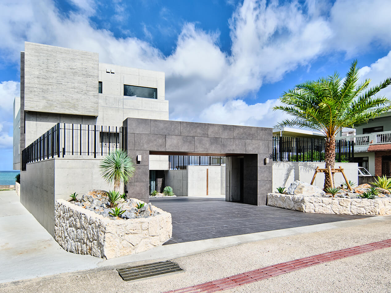 海を望む絶好のロケーションに建てられた邸宅です。開口部は深い庇があるテラスの奥に配置され、暴風の際はシャッターを閉じることもできます。テラスでは庇を広く設けており、雨の日でも屋外の景色を楽しめます。