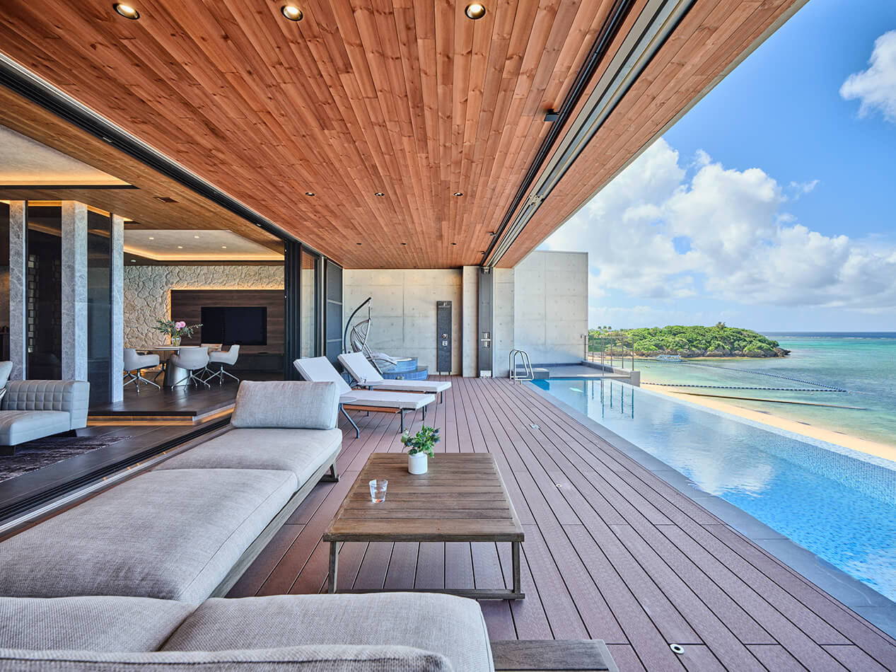 またLDKの床の延長線上にはプールの水景が広がり、さらにその先に美しいエメラルドブルーの海がつながる圧巻の景色が特徴です。