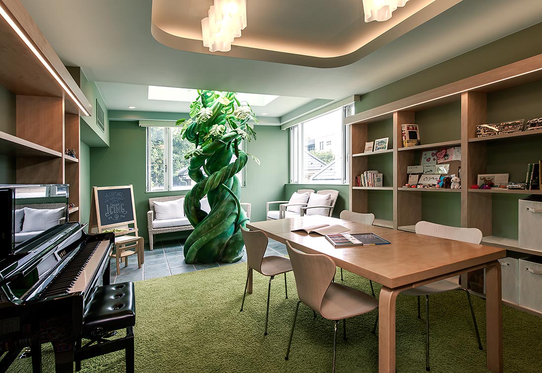 幼い頃に抱いた「理想の家」を、大人の感性で実現した邸宅です。地下2階から地上2階の4フロアごとにテーマを決め、地下2階のシアタールームや地下1階のプールでは海や川を、1階のテラスでは大地を、2階や屋上では森や空を表現しています。4フロアをつなぐLEDライトを組み込んだ階段室の壁は7色に変わり、フロアごとのテーマに沿う色彩を演出。遊び心を残しながらも、素材選びや照明デザインに上質さをプラスしました。家族の記憶を紡ぎながら、日々の暮らしに豊かさと夢を添える住まいです。