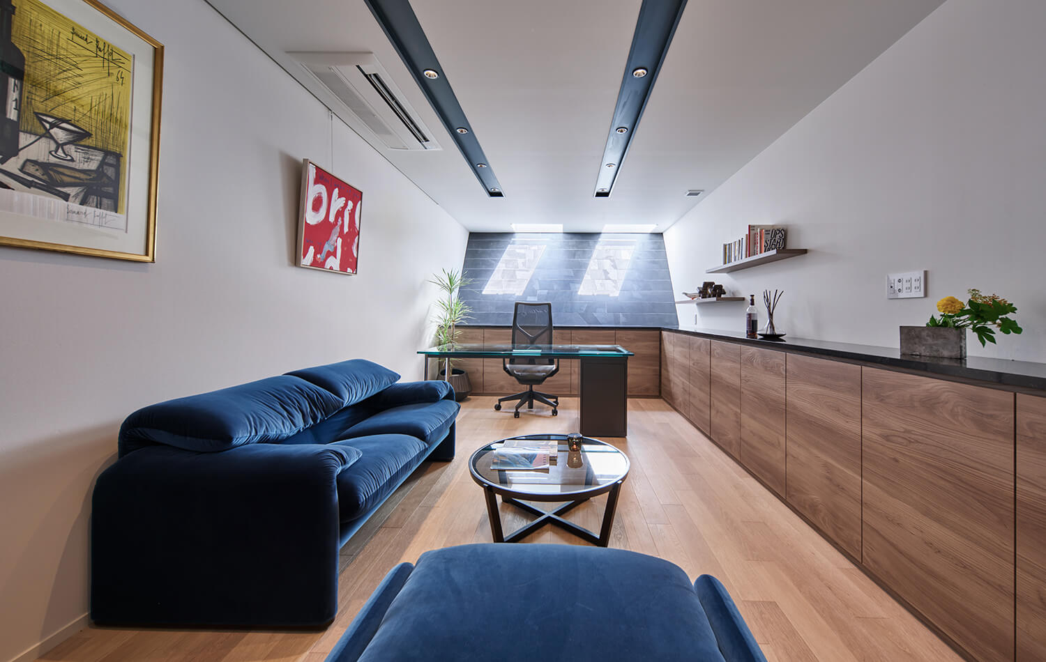 空間に陰影をつくることで、書斎に奥行きと静けさが生まれる。