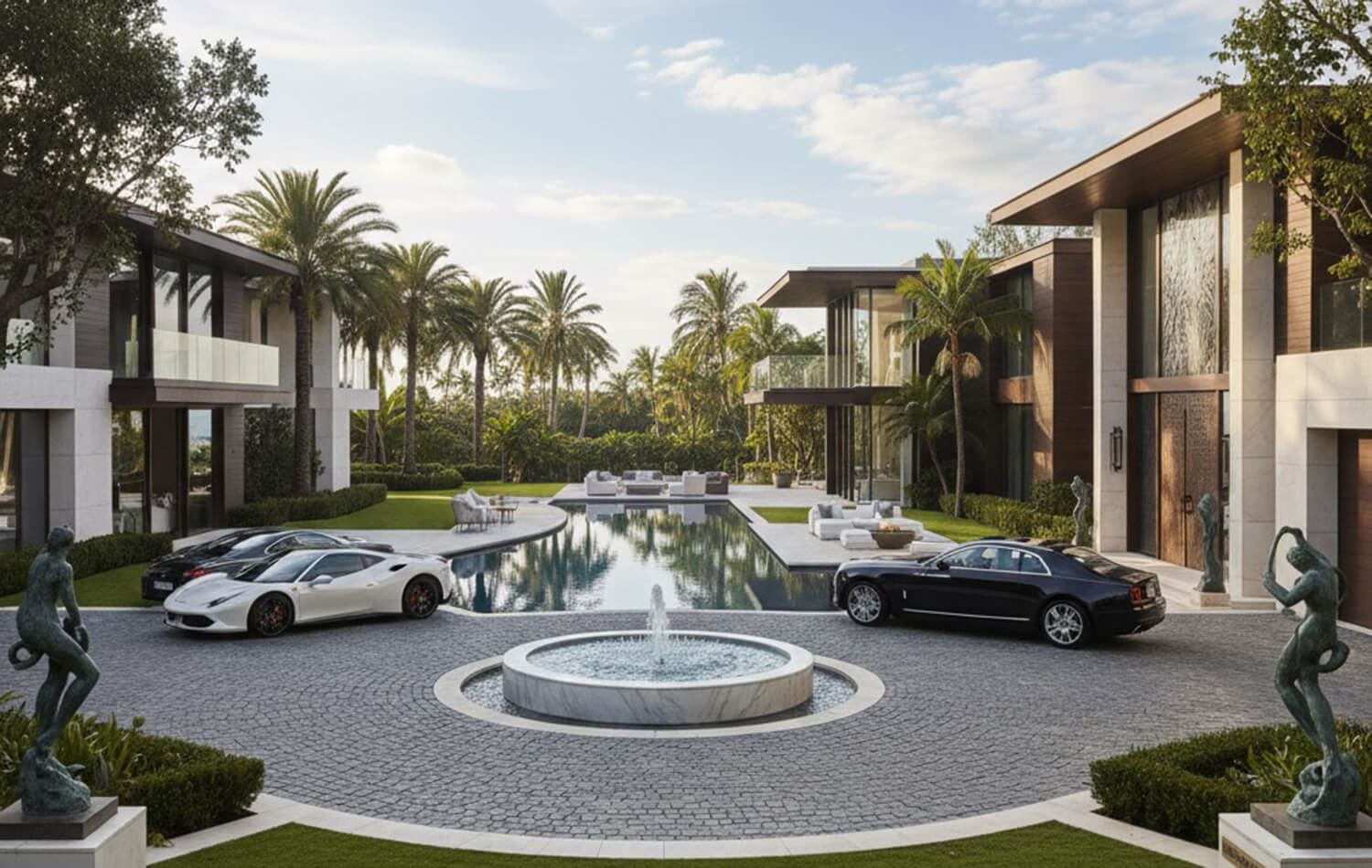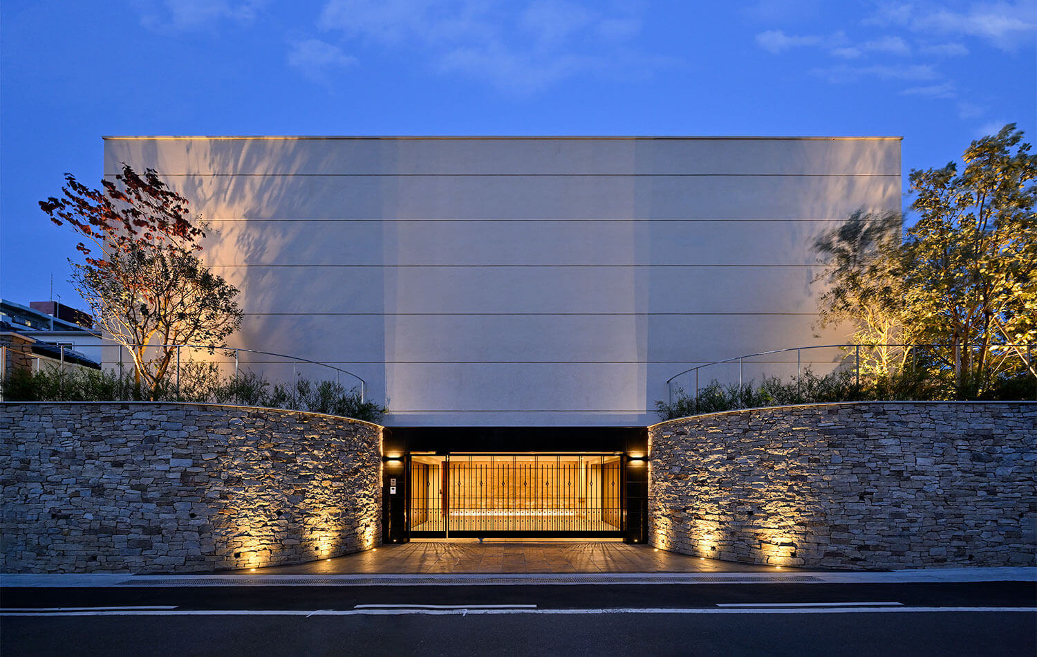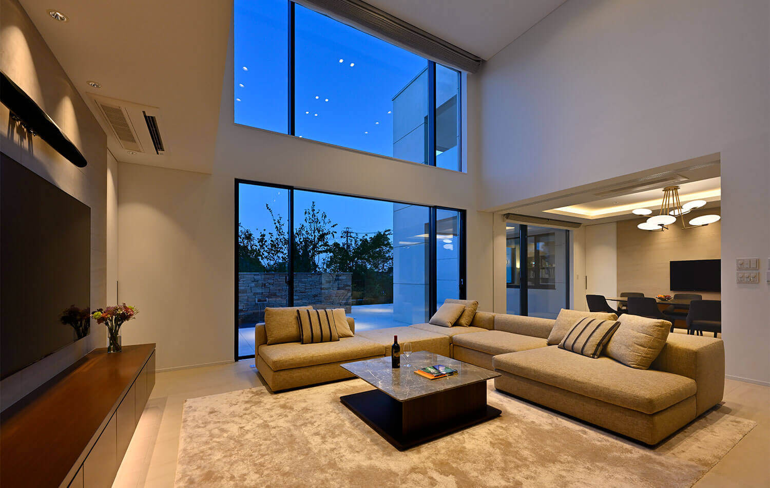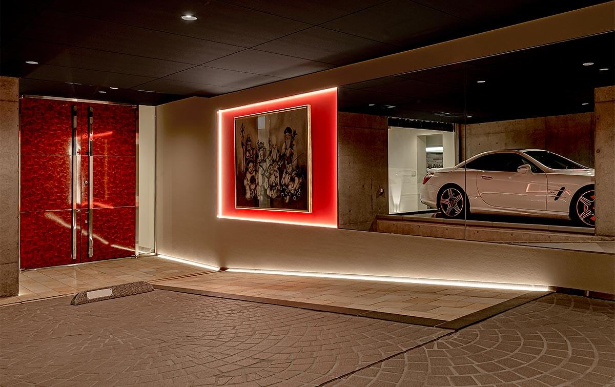 モダンさの中にナチュラルな要素を取り入れたデザイン。外観は悠然とした佇まいを引き出すためシンメトリーを意識しており、門から敷地内を進むアプローチに屋根をかけ、天空のレッドカーペットのようにゲストを誘導します。エントランスは3層の吹き抜けとし、アプローチでは奥行きと対比させるように縦方向の広がりを演出しています。