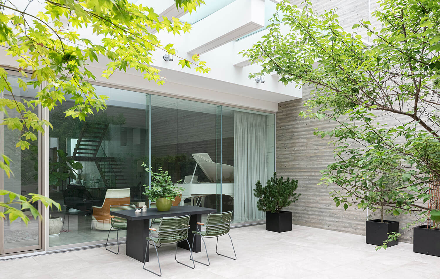 建物に囲まれた中庭(コート)は、周囲の視線を抑えながら、光や風、空の広がりを住まいの中心に取り込むための空間です。敷地条件が限られやすい大阪の高級住宅街では、外部との距離感を丁寧に整え、家族だけの時間を守る住まいが求められてきました。